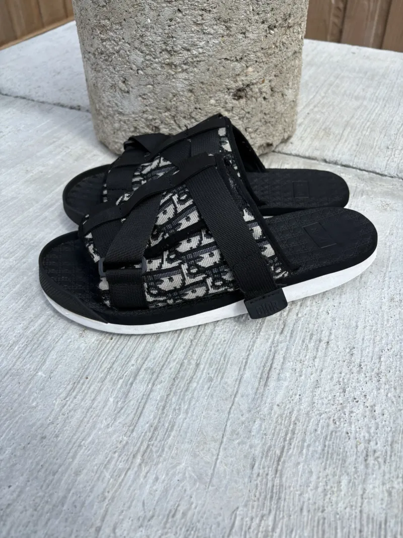 These Dior Alpha sandals feature beige and black Dior Oblique jacquard, a pattern originally introduced in 1967. These sandals have a sturdy two-tone rubber sole with black nylon straps, 'Dior' logo on the sides and a front rubber patch to protect the toe. Wear it with jeans or trousers to elevate your casual attire.