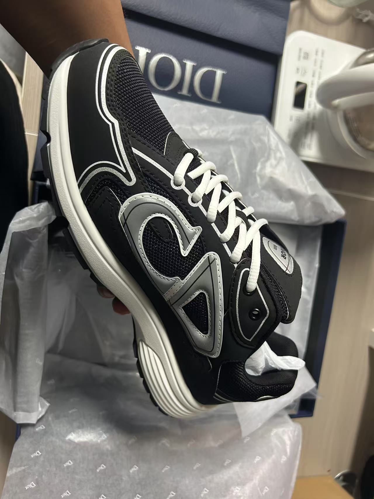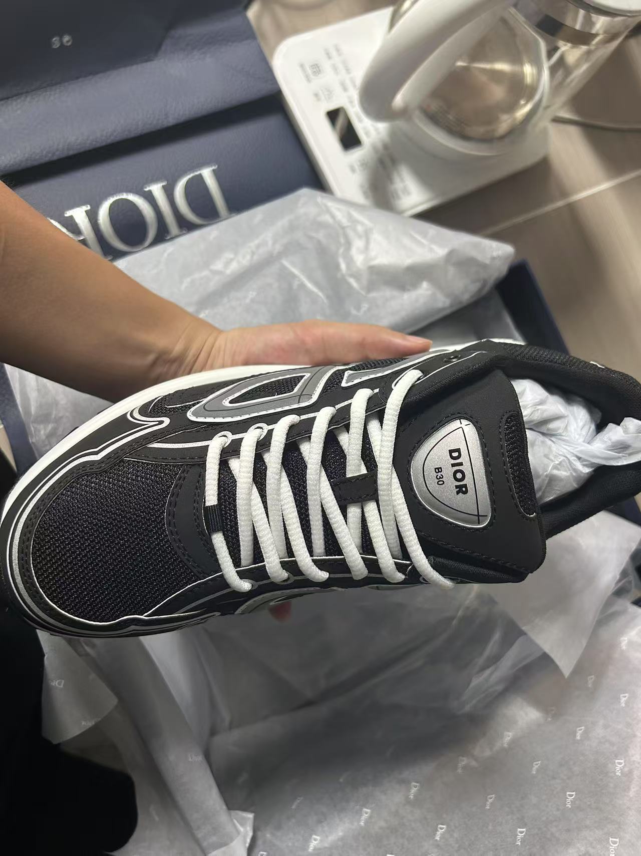 The B30 sneaker has become a new House essential distinguished by its modern and sporty silhouette. Crafted in black mesh and technical fabric, it is enhanced by a reflective tonal 'CD30' signature with a graphic aesthetic. The B30 also features silver-tone 'DIOR B30' and 'CD30' signatures on the tongue and the back of the sneaker. A sculpted and ultra-lightweight rubber outsole spotlights various hallmark details, while an elastic interior provides optimal comfort. The B30 sneaker will complete any casual outfit.