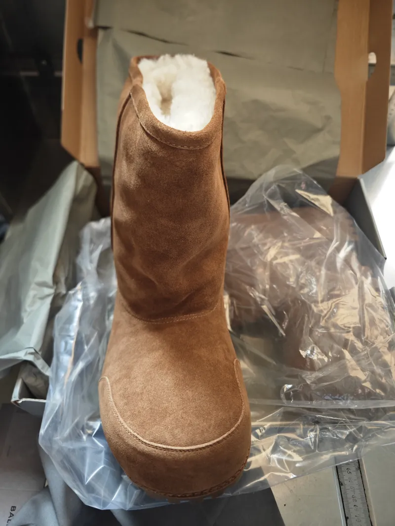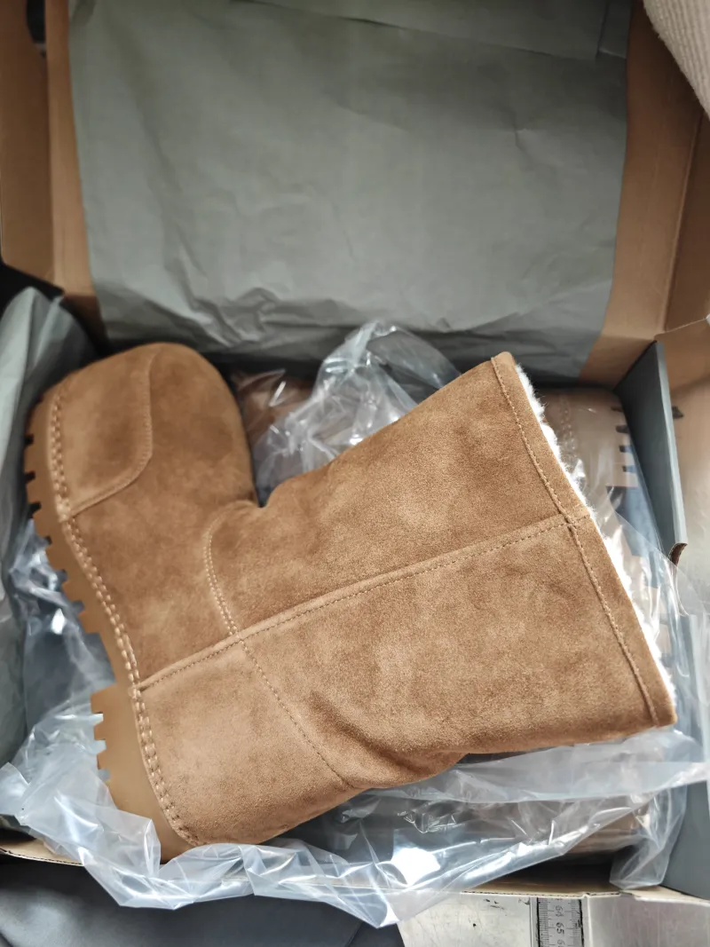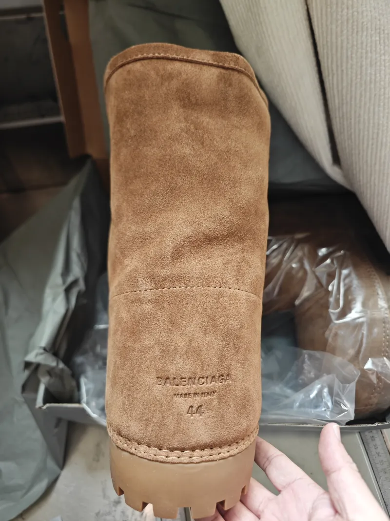 Balenciaga's extreme aesthetic and exaggerated proportions define this suede boot from the fall '24 line featuring a lugged rubber sole and faux-fur lining