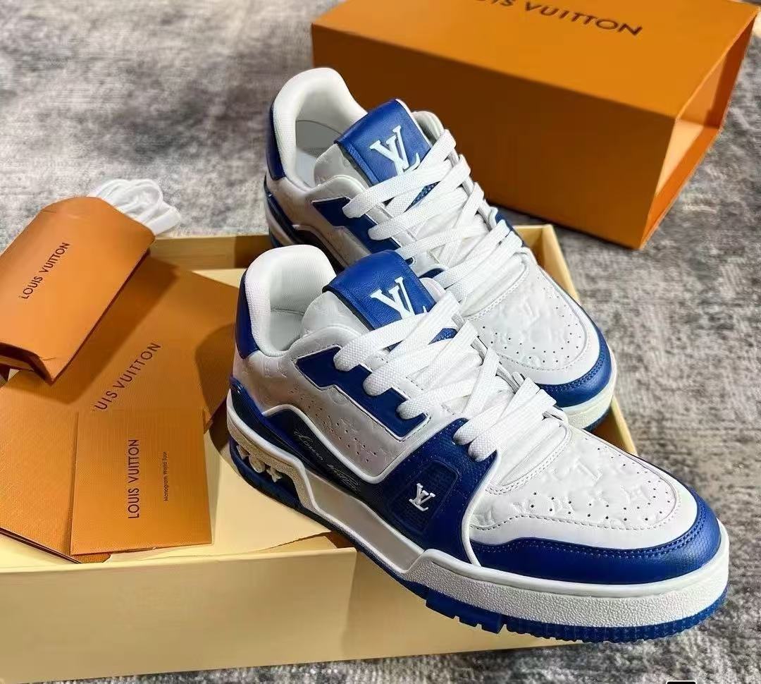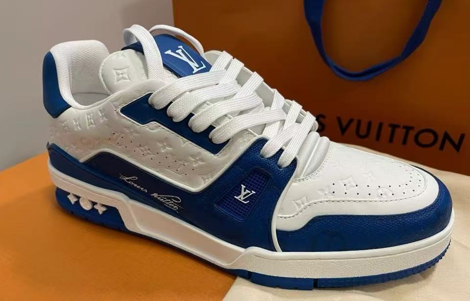 This edition of the Louis Vuitton Trainer sneaker teams smooth calf leather with grained calf leather embossed with Louis Vuitton's signature Monogram pattern. This cult model was designed by Virgil Abloh, who drew inspiration from vintage basketball sneakers. It is revisited in pastel colors highlighting the elaborate construction of its upper, which takes seven hours to stitch.